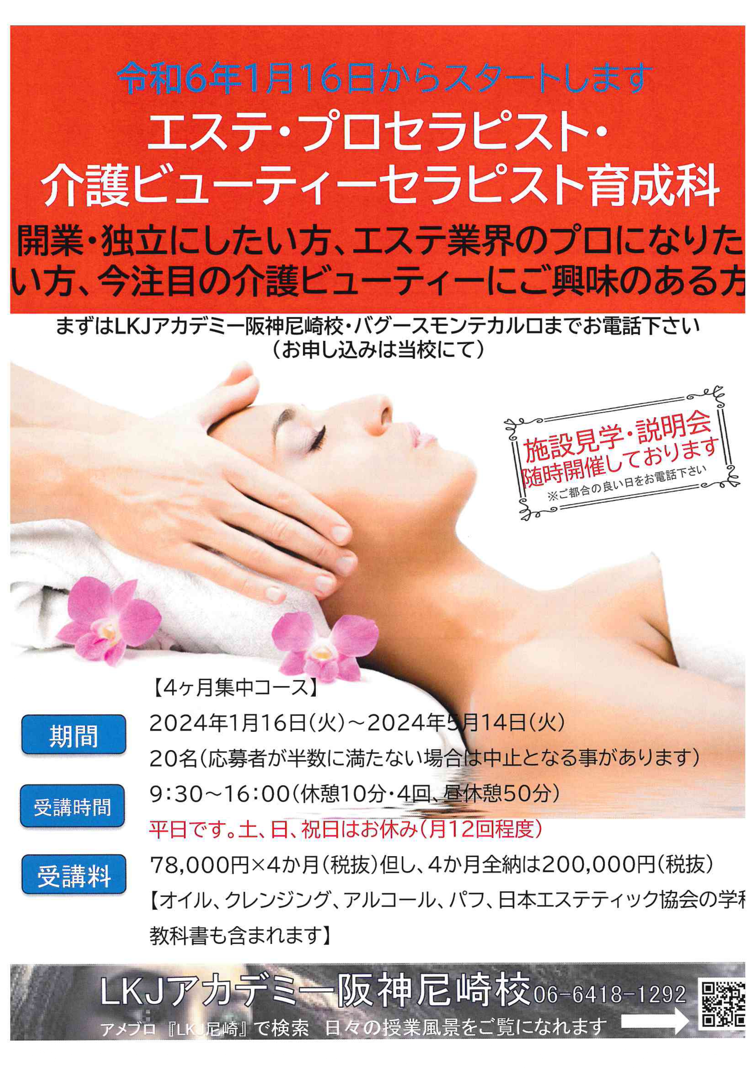 1か月78,000円(税抜)×4か月全納時200,000円(税抜)オイル・クレンジング・アルコール・パフ・教科書は含まれております